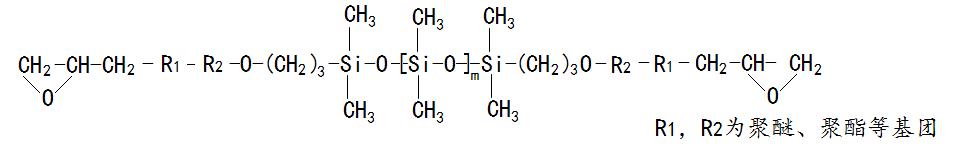 多元共聚环氧硅油分子结构经过特殊设计,经过特殊合成方法,使分子两端具有环氧基团,主链上带有聚氧乙烯醚、有机硅、聚酯、酰胺等基团,属线性多元共聚而成的有机硅中间体。由于其具有环氧基团,可以和胺基类物质进行反应。